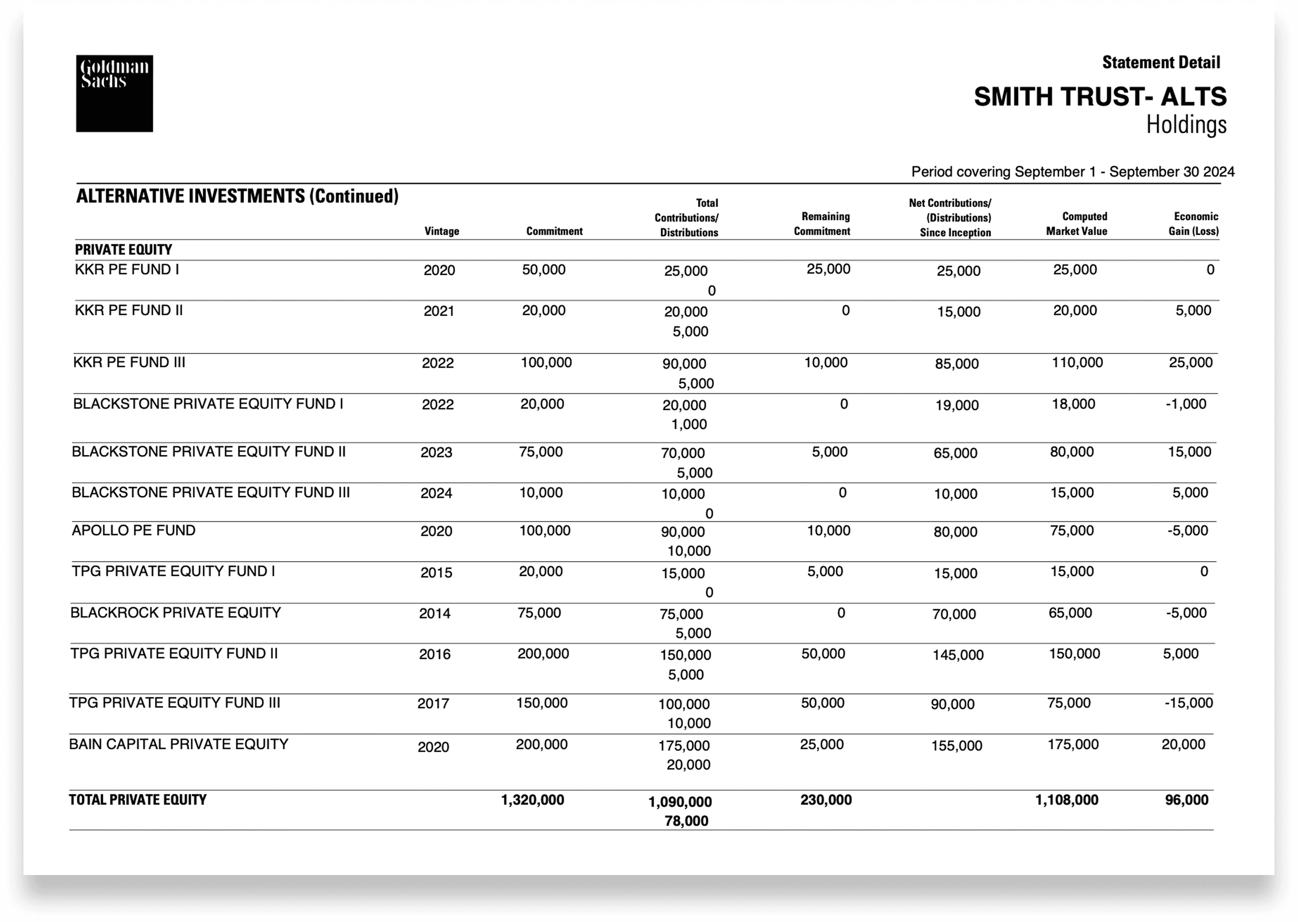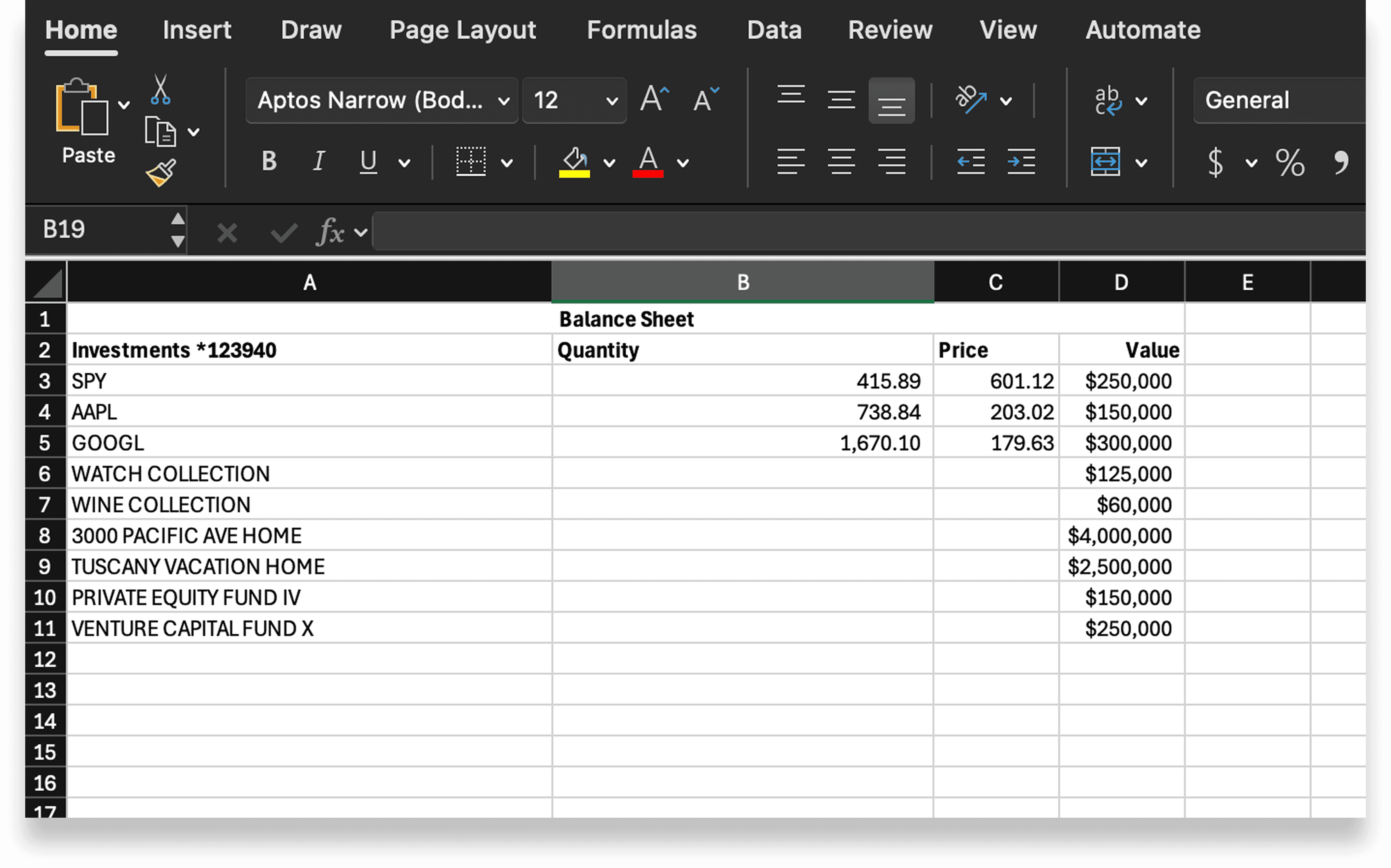 Brokerage, 401k, IRA, Private Assets, Balance Sheets, Vesting, Estate, Wills, Tax, Insurance, Asset Decks and more
